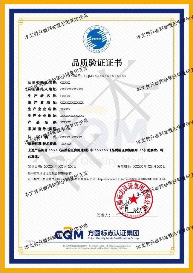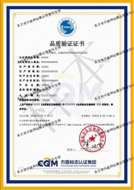 為加強對方圓自愿性產(chǎn)品認(rèn)證標(biāo)志的管理,確保產(chǎn)品認(rèn)證標(biāo)志的正確使用,維護產(chǎn)品認(rèn)證標(biāo)志的權(quán)威性和CQM的信譽,方圓標(biāo)志認(rèn)證集團依據(jù)國家認(rèn)證認(rèn)可的相關(guān)要求制定了產(chǎn)品認(rèn)證標(biāo)志使用規(guī)范。標(biāo)志基本樣式: